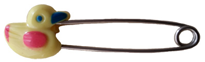 They have stainless steel shafts with a very sharp point. Sharper than any other pin we have ever tried. The head is all plastic safety catch preventing the diaper pin from coming unfastened and sticking the baby. These pins are suitable for the thickest night diapers and babies over 75 pounds. In addition to being very functional the colorful plastic ducky will delight your baby. This pin is much larger than those for small babies. To pin diapers with this size pin requires that you keep the pin at a low angle to the diaper and push it through with finesse. Keep one finger between the baby and the diaper to prevent poking the baby. You should only pin the outer diaper when double diapering and the thinner side panels in a prefold diaper. You can rub the pin across ivory baby soap or a trick that mothers from the 50's used was to pass it through their hair to provide a lubricant to assist in pinning the diapers. When done properly the pin should just slide in place without damaging the diaper. Another concern that most mothers know but it's worth repeating here is that diaper pins should be place sideways back to front as opposed to standing up pointing at the waist. Not only is it safer in the event of a pin coming unfastened but it's much more comfortable instead of sticking baby in the tummy when they sit.